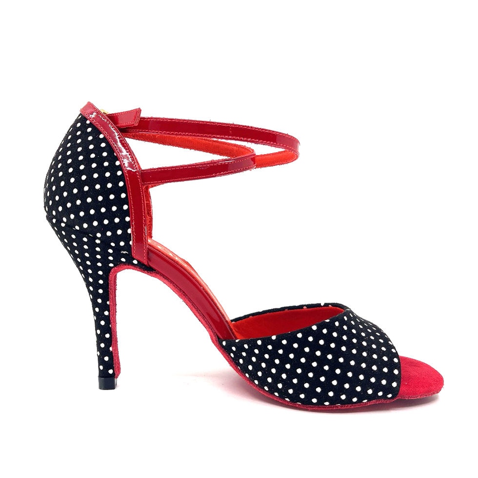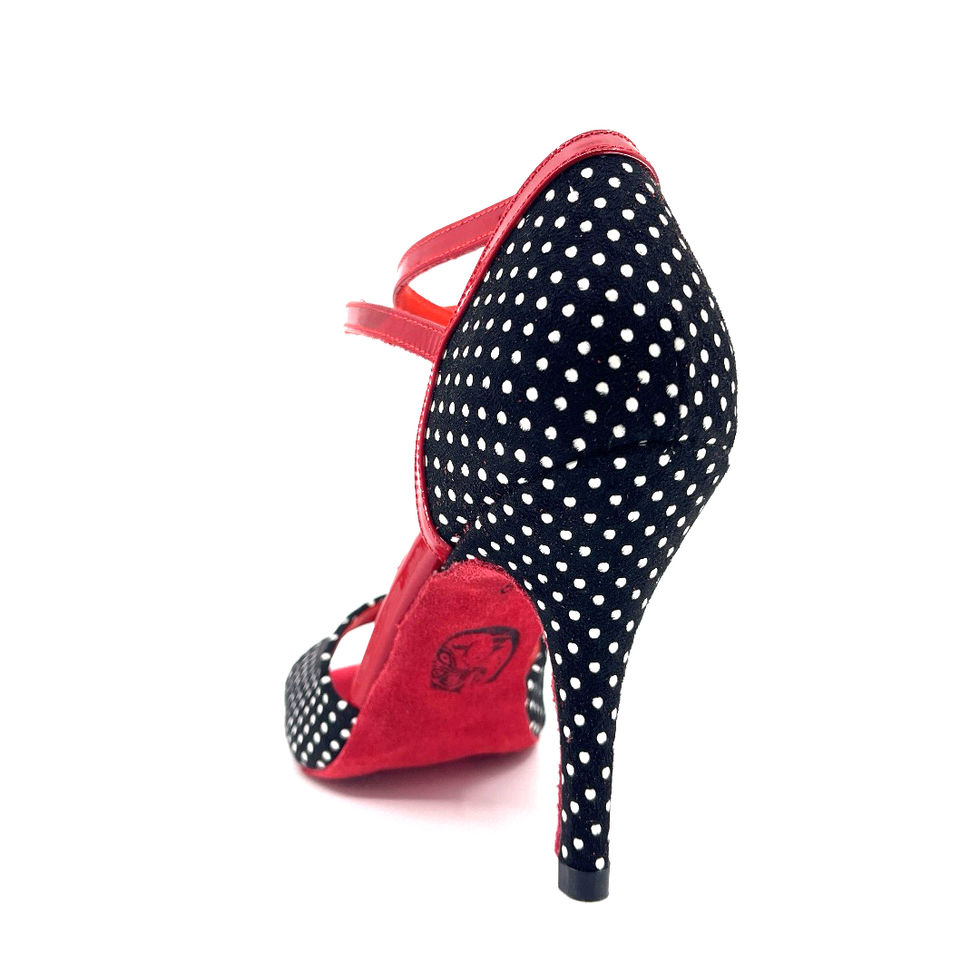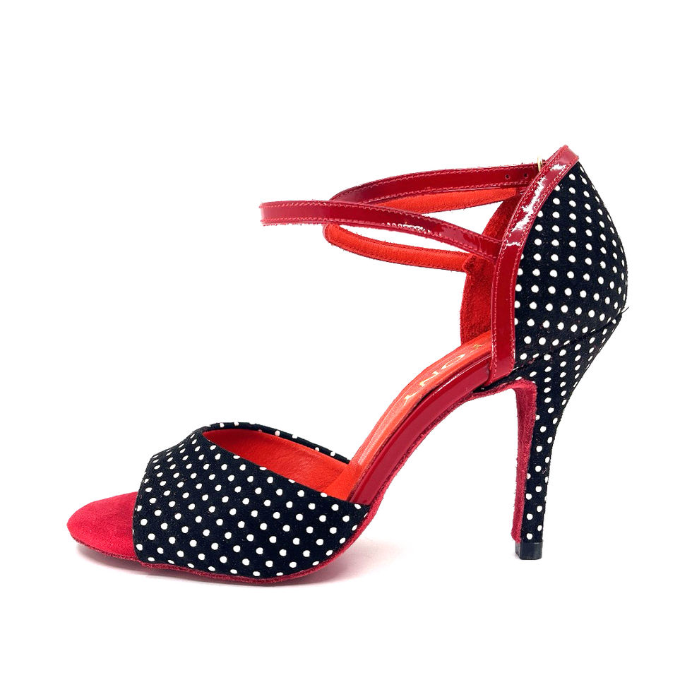 The black and white polka dot surface combined with red patent leather details creates a model that is both playful and bold. With its lightweight structure, balanced form, and dance-friendly sole,